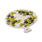 Detos je keramický podnos okrúhleho tvaru. Je to podnos na prípravu a servírovanie domácej klobásky alebo na chutne nakrájaný syr. Je ručne maľovaný v motívoch tmavých a zelených olív. Podnos je následne glazovaný.