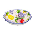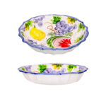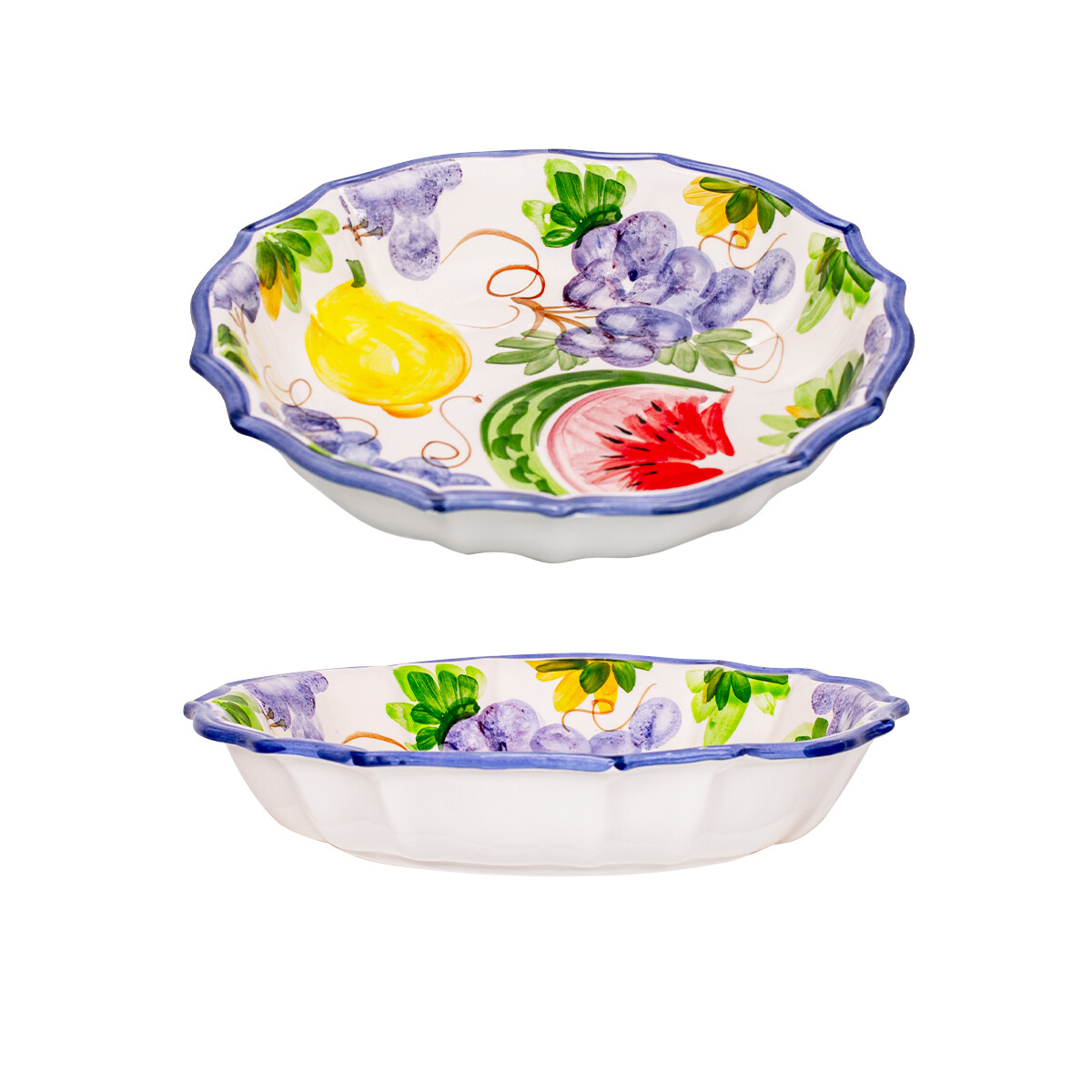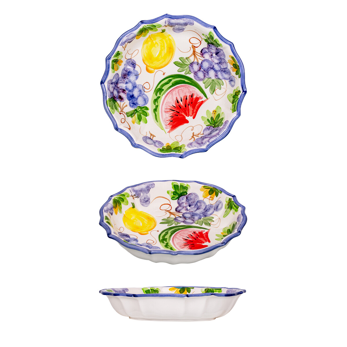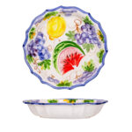 Fineta – Táto nádherná mierne vlnkovaná okrúhla keramická miska s modrým lemom je oslavou letných chutí a farieb. Ručne maľovaný motív dozretého červeného melónu, svetlo žltých citrónov a sladkého hrozna prináša sviežosť a radosť na váš stôl. Každý detail je spracovaný, dodáva miske nádherný lesk a vyžaduje jej dlhú životnosť. Ideálna na servírovanie ovocia, šalátov či iných pochúťok, táto miska vnesie do vašej kuchyne pravú atmosféru slnečného Talianskeho leta.
