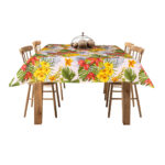 Florio – Letné kvety – Krásny elegantný pestrofarebný kvetinový obrus s žltými a červenými nápadnými kvetmi a zelenými listami, vytvára letný a osviežujúci motív. Jeho farebná paleta prináša do vášho interiéru žiarivú a radostnú atmosféru. Obrus je ideálny pre letné oslavy, záhradné party alebo romantické večere na terase. Vyrobený z kvalitnej látky, je ľahký na údržbu a prispieva k pôvabu vašich spoločenských udalostí.