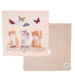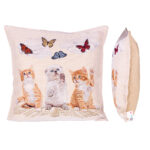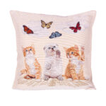 Gatto Trio – Mačacie Hry s Motýľmi.  Vitajte v kúzle hravosti na našom malom vankúši s gobelínu, kde sa predstavujú tri malé mačiatka, ich neodolateľné postavičky vystihujú túžbu po farebných motýľoch. Ich hravosť a zvedavé pohľady vytvárajú dojem, akoby chceli dotknúť sa farebných krídel motýľov. Na jemnom béžovom pozadí sa vytvára scenériu harmónie, pridávajúc do vášho interiéru radostný a pohodlný dotyk.“