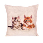 Vilma & Hugo – Roztomilá Dvojica na Béžovom Plátne.Vitajte v náručí nášho elegantného vankúša s gobelínu, kde sa predstavujú dve malé mačiatka s menami Vilma a Hugo. Ich roztomilé postavičky, jedno hnedé a druhé hrdzavé, prinášajú do vášho interiéru nevinný a láskyplný dotyk. Na jemnom béžovom pozadí sa ich hravosť a šarm vyčnievajú, čím sa vytvára exkluzívny kúsok, ktorý prinesie pohodu a štýl do vášho domova.