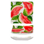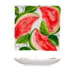 Zeroso – Štvorcová miska vás očarí živým motívom červeného vodného melóna. Žiarivá červená farba šťavnatých kúskov v kontraste s jemným pozadím dodávame misku sviežosť a chuť. Precízne ručné maľovanie a lesklá glazúra zvýrazňujú jej výnimočný charakter. Ideálna na servírovanie šalátov, príloha či ovocia – vnesie na váš stôl atmosféry talianskeho leta a radosť z jedla.